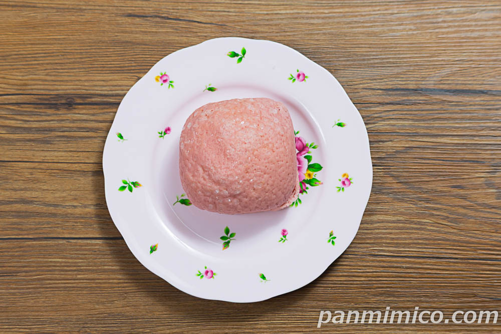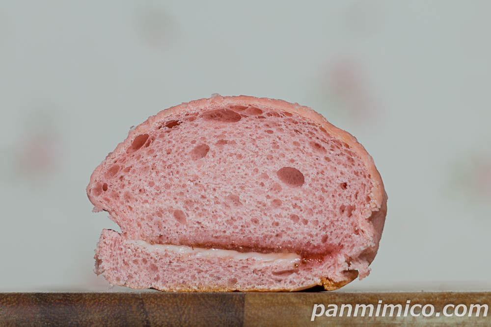 パン生地は、ギッシリめだが、ふんわり。しっとりを通り越して、ちょっとネチョネチョした白パン系の食感。あんまりイチゴの風味はしないが、ごくごく微かな酸味があるような気もする。
