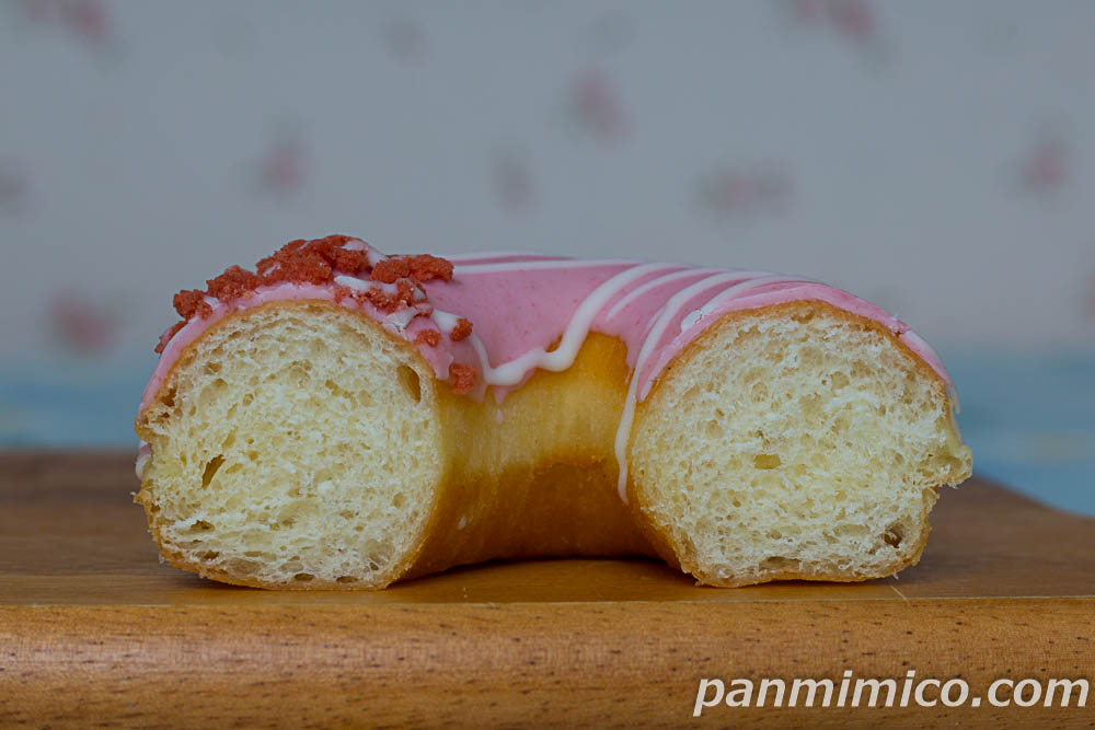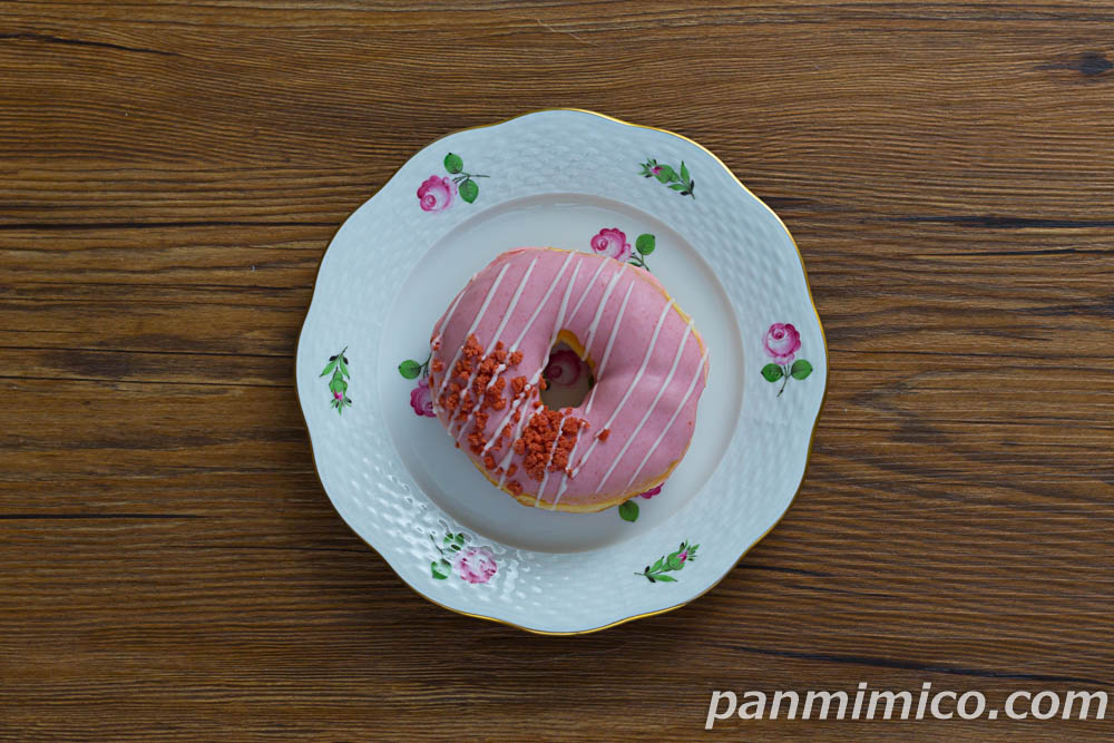 いちごコーチングしたドーナツ。ホワイトチョコの線がけと、乾燥イチゴをトッピング。