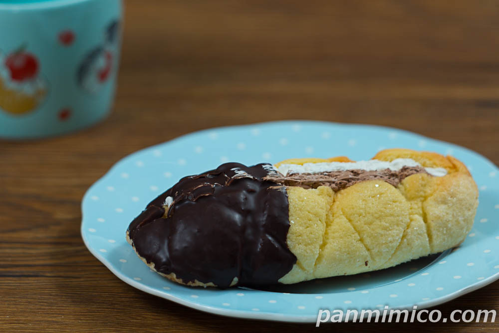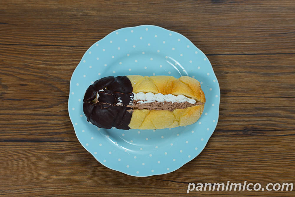 ミルクホイップとチョコホイップをサンドした、ロールパン形状のメロンパン。チョコをコーティング。