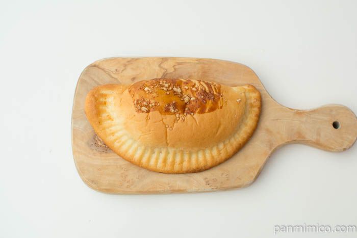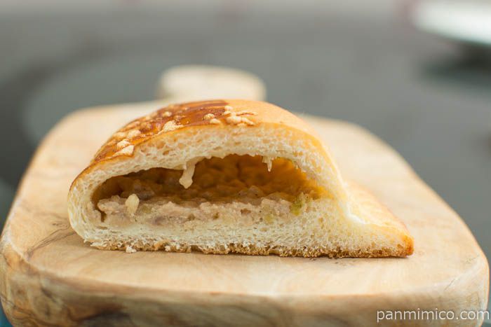 餃子の具フィリングを包んだ餃子のカタチのパン。トッピングにチーズ。
