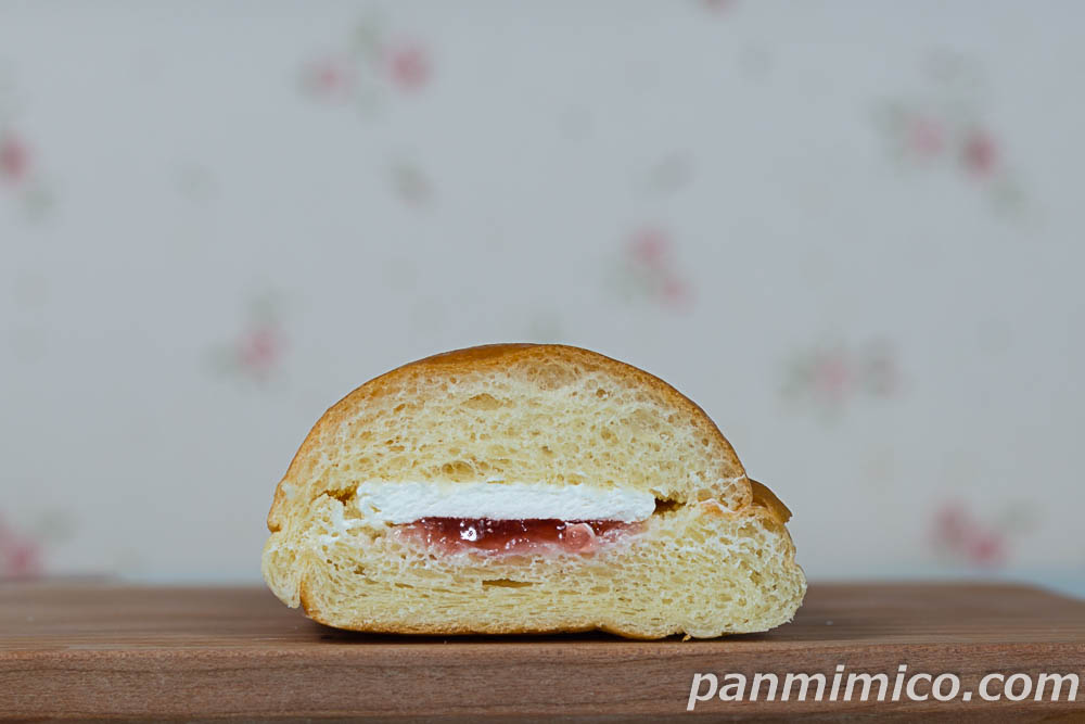 生クリーム入り牛乳ホイップとイチゴジャムをサンドしたロールパン。パン生地にも、生クリームを練り込んでいる。ホイップは、「森永のおいしい牛乳」を使用。