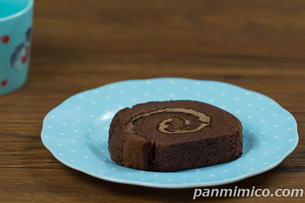濃厚なチョコホイップ、濃厚なチョコソース、チョコチップを巻き込んだチョコロールケーキ。