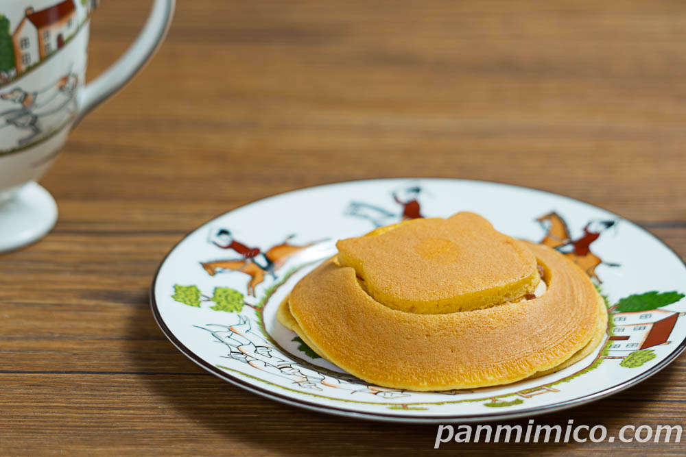 猫の型抜きをしたどら焼生地で、キャラメルホイップとソース、ザクザクのカラメルチップを挟んだ生どら焼。