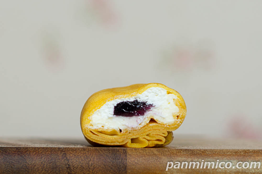 ホイップクリーム、レアチーズムース、ブルーベリーソースを包んだクレープ。