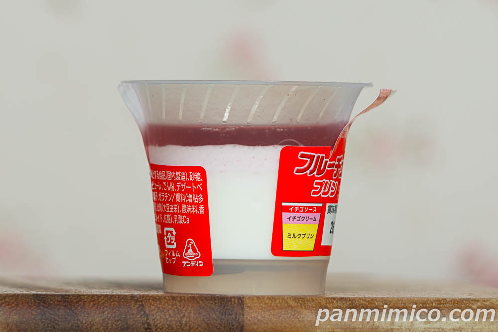「フルーチェ」のイチゴ味を再現したプリン。いちごソース、いちごクリーム、ミルクプリンの3層仕立て。