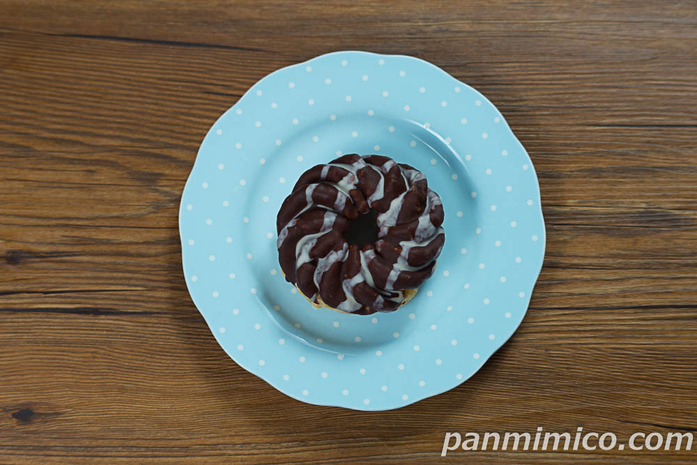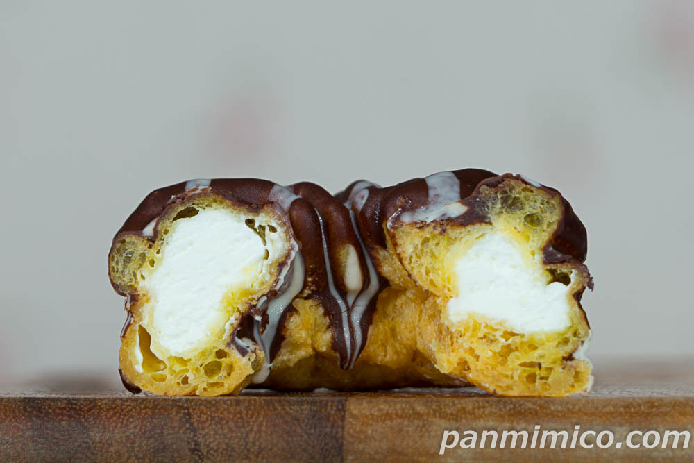 ミルクホイップを包んだフレンチクルーラー。チョココーティングをして、ホワイトチョコをトッピング。