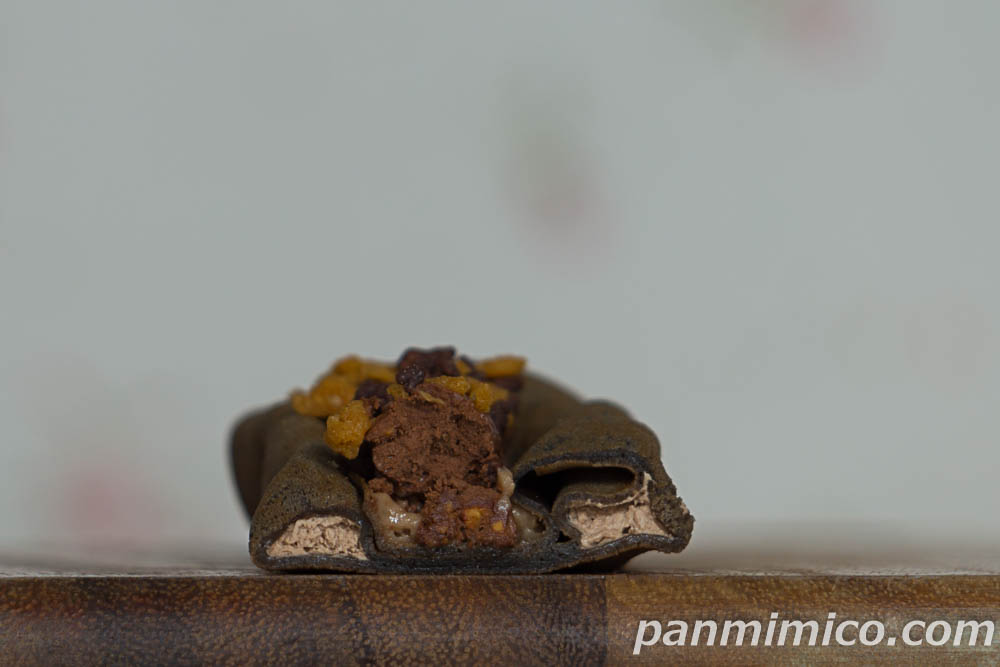 クレープ生地:モッチリ、モチモチ、ネチョネチョ!お餅のような弾力で包み込む、甘いココア風味。