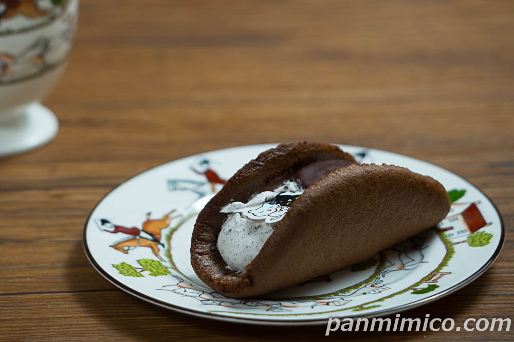 ココアクランチ入りクリームを包んだココアオムレット。クロネコをイメージしたネコ型のビスケットをトッピング。