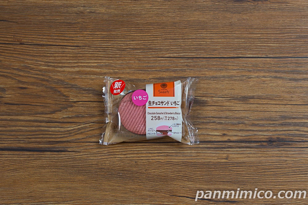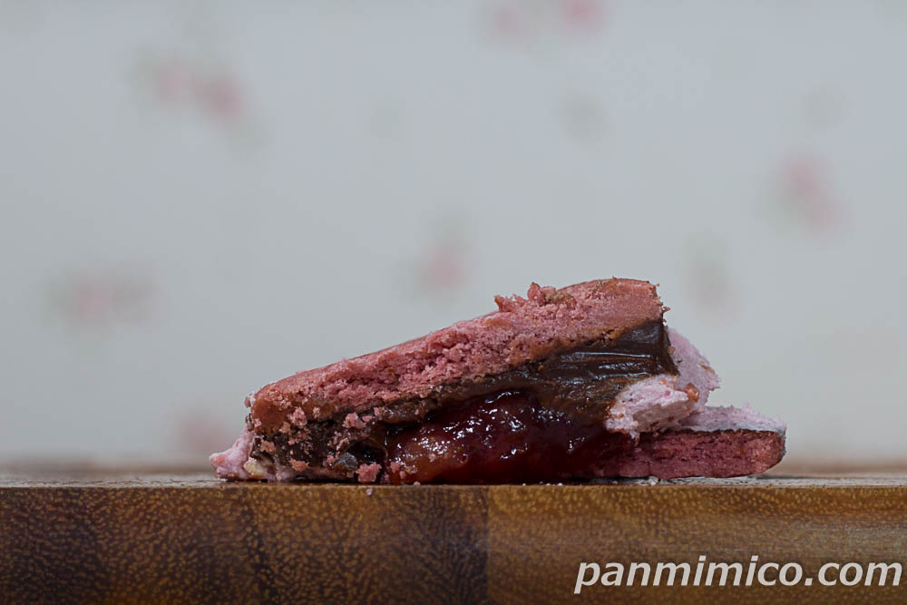 いちごクリーム、生チョコレート、イチゴソースをサンドした、ビスケットサンド。ビスケット生地も、イチゴ風味。