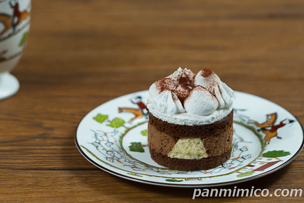 バニラクリームとチョコレートクリーム、チョコチップをチョコレート生地でサンド。ホイップを絞ってココアパウダーをトッピングしたケーキ。