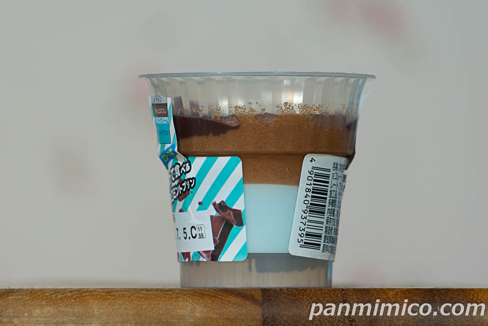 天面のチョコをスプーンで割って食べるチョコミントプリン。チョコ・チョコスフレ・ミントクリーム・ミントプリンの4層仕立て。