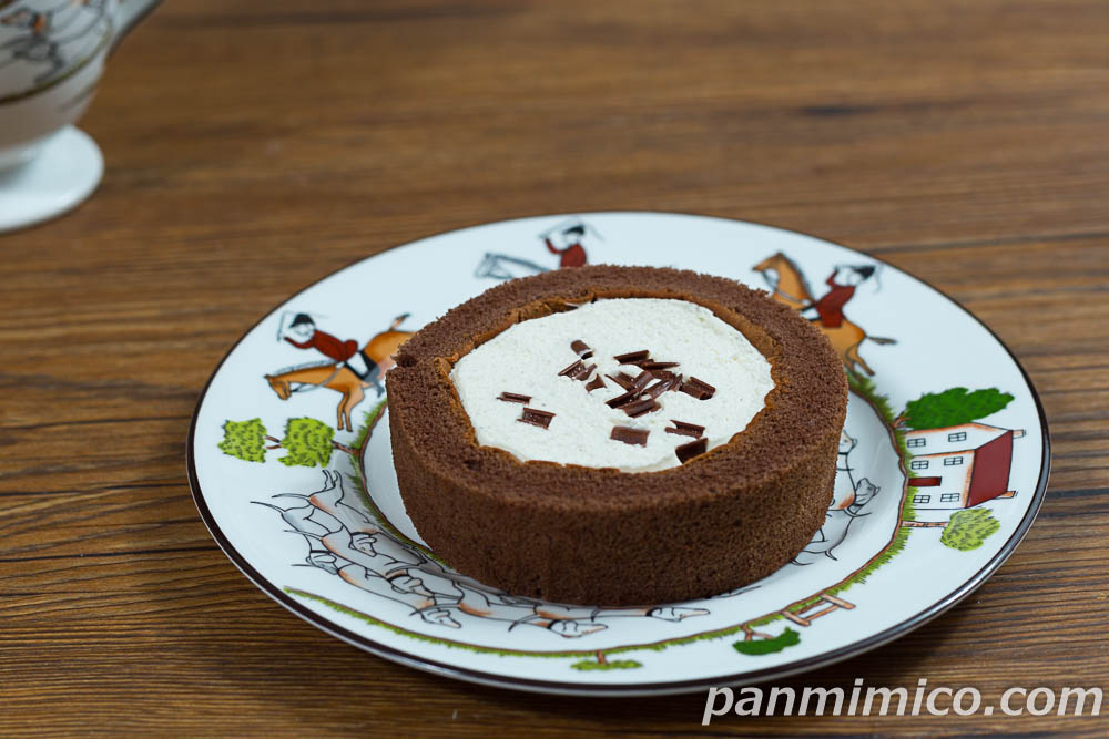バニラクリームとチョコクリームを巻いたロールケーキ。削りチョコをトッピング。