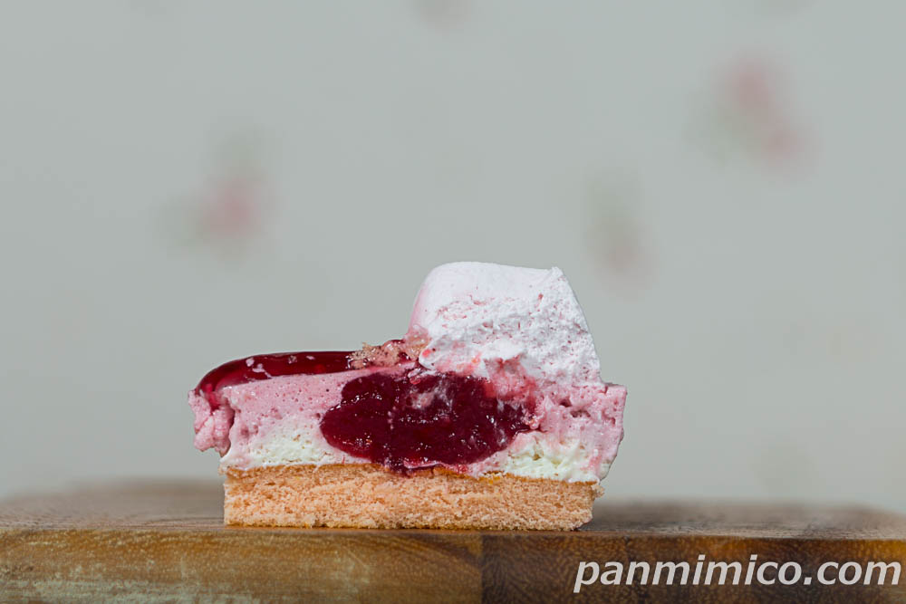 1番底には、ピンク色のスポンジ。スッゴク、しっとり。ふわ~っとイチゴっぽいなぁ・・・あ、でも、酸味もあって、ラズベリーっぽいし。豊満なクランベリーな感じもする~。