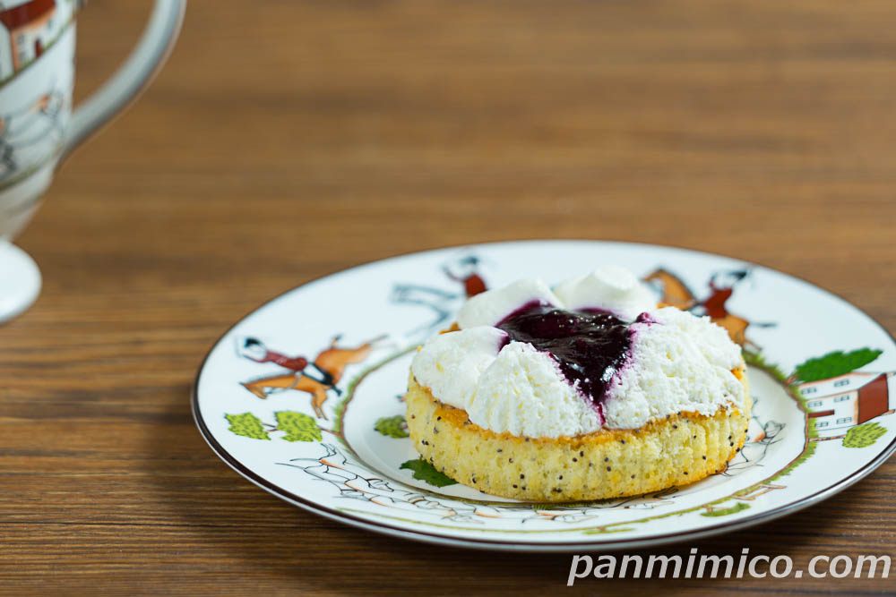 ブルーベリーと、お花模様に絞ったクリームをトッピングしたポピーシードケーキ。