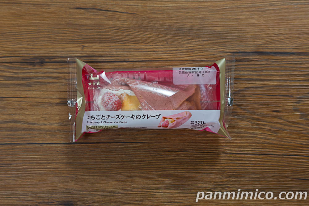カスタードホイップクリーム、果肉入りいちごソース、ベイクドチーズケーキを包んだクレープ。半分にカットした生いちごをトッピング。カスタードホイップは北海道産生クリームを使用。