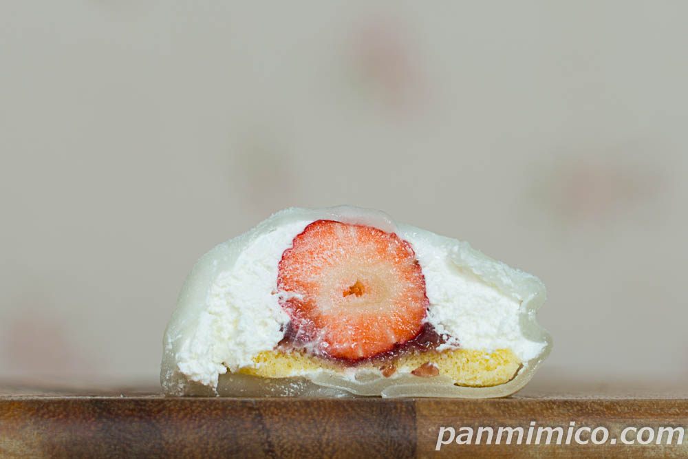 求肥(国内製造)、ホイップクリーム、つぶあん、苺、砂糖、卵、小麦粉、粉糖、牛乳、乳化油脂、油脂加工品、白こしあん、バター/ソルビット、加工デンプン、乳化剤、セルロース、膨脹剤、エノキエキス、香料、pH調整剤、酵素、V.C。